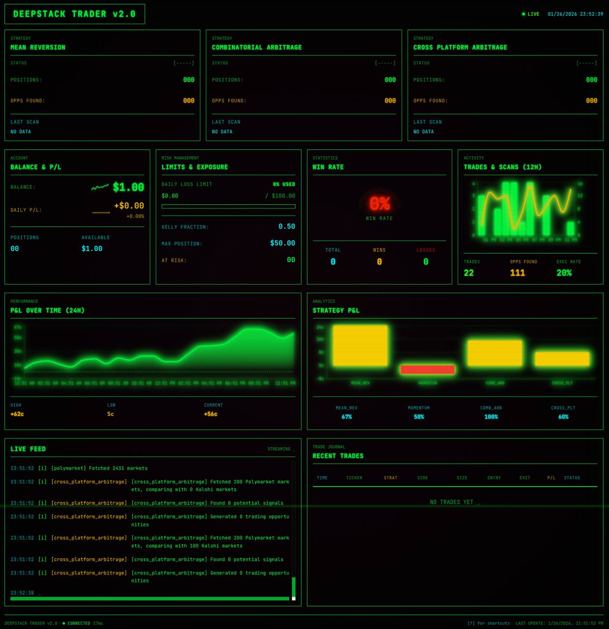 The real-time dashboard: green phosphorus terminal aesthetic, live market feed, ASCII charts showing P&L. All built tonight.